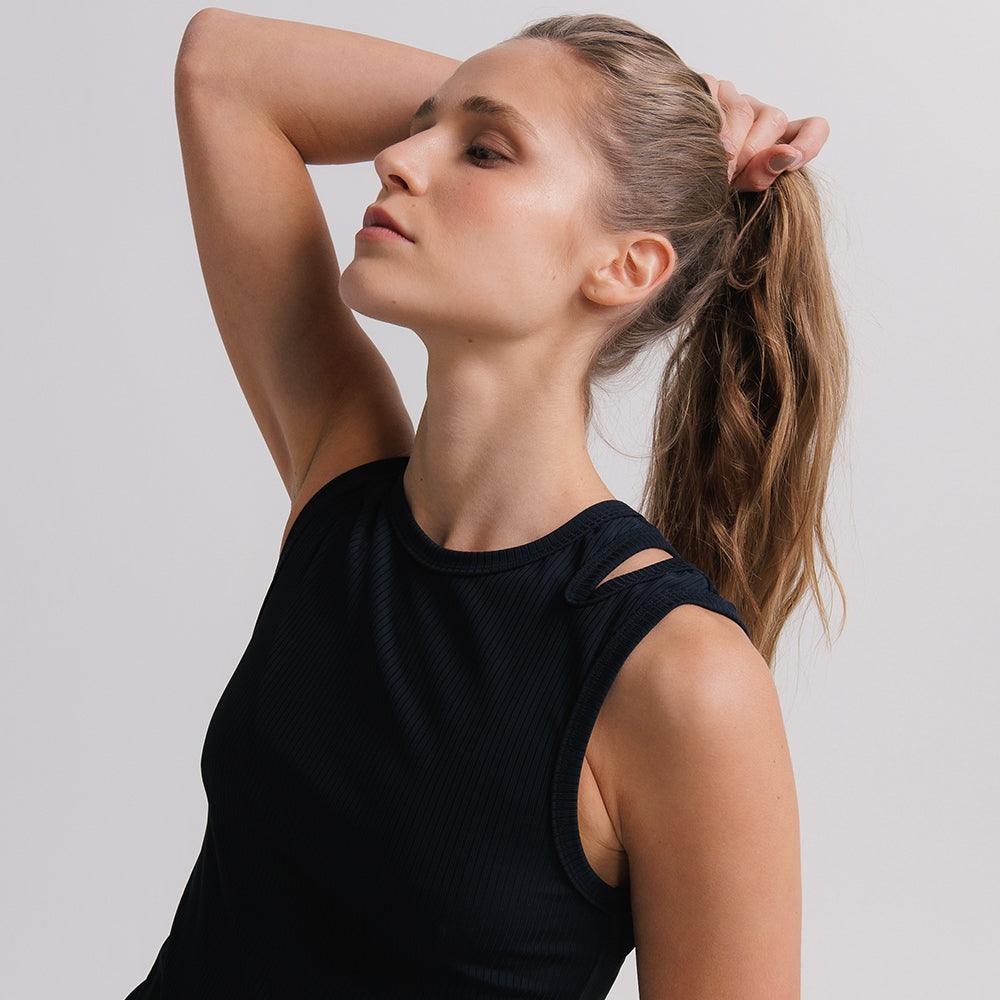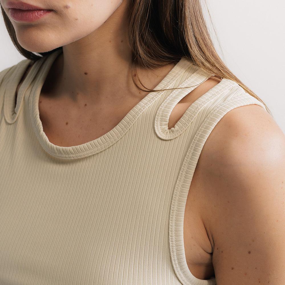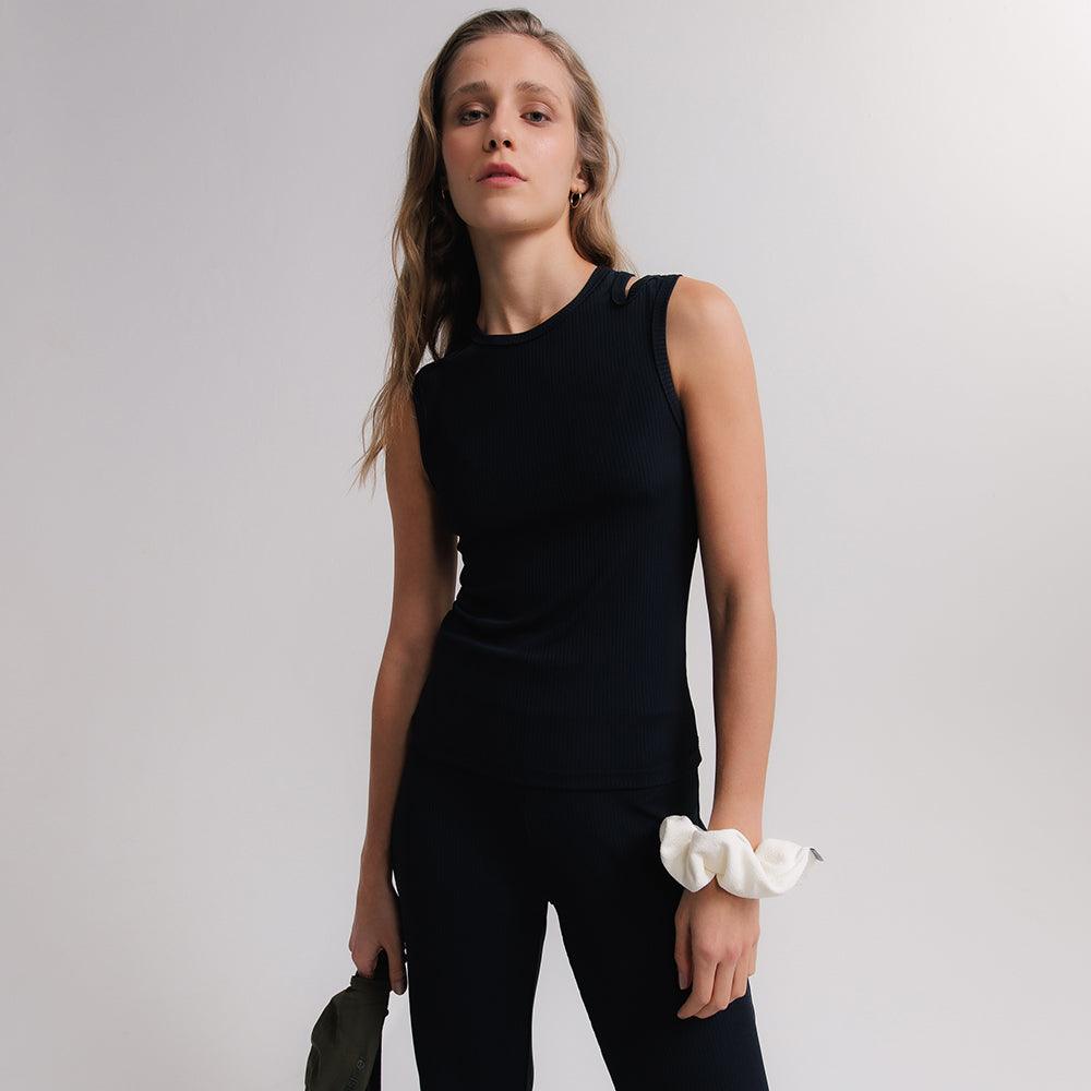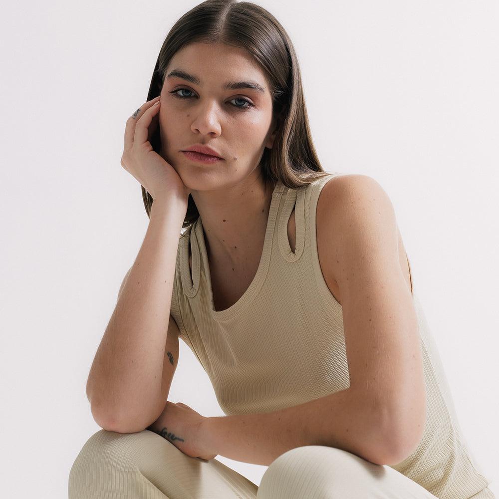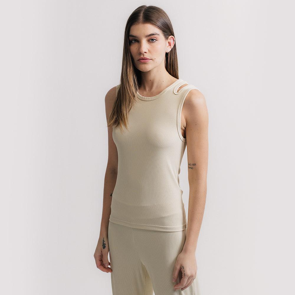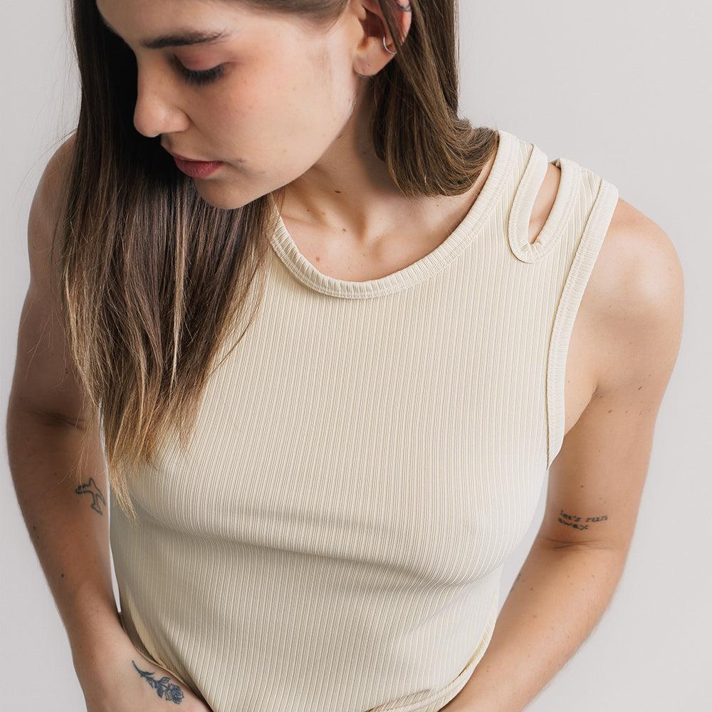 Regata ultra versátil, um must have que funciona como peça principal e por baixo de sobreposições. Seu desenho de recorte geométrico nas alças traz uma leitura distinta ao item essencialmente clássico. O tecido super macio canelado é puro conforto e delicadeza, deve ser tratado com cuidado