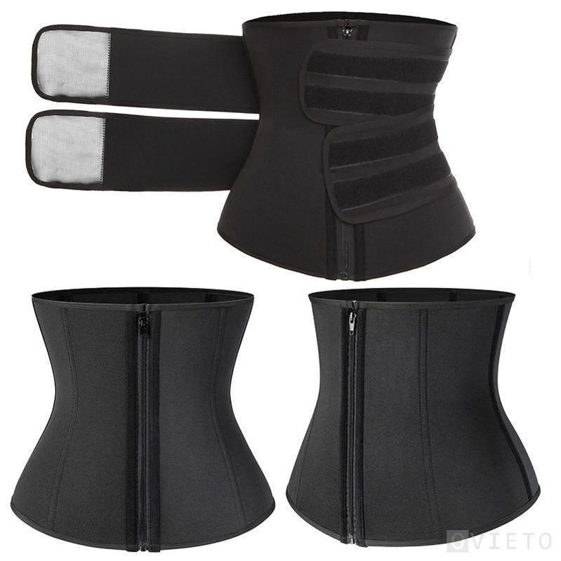 Cintura ajustável no fechamento dianteiro do zíper com fechamento duplo em velcro: o zíper dianteiro mantém a cintura alinhada, reduzindo a tensão ao longo da coluna, favorecendo a perda de peso ao mesmo tempo que favorece a colocação e a remoção da cinta.