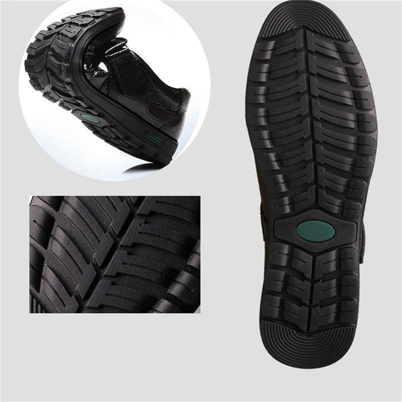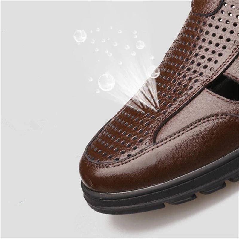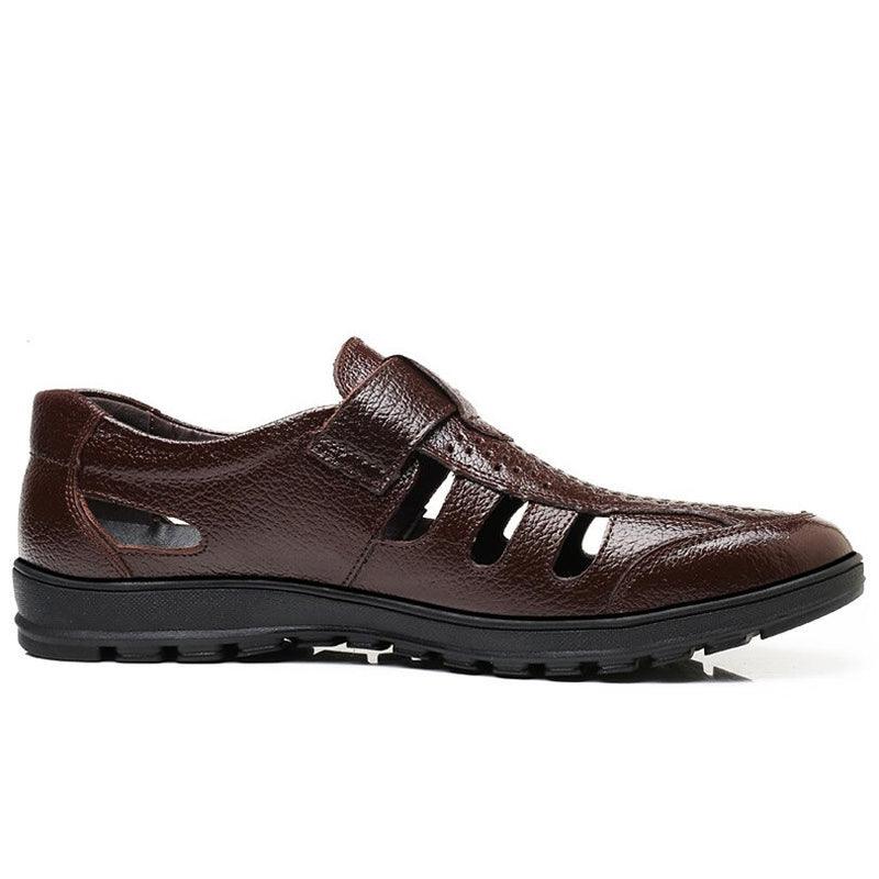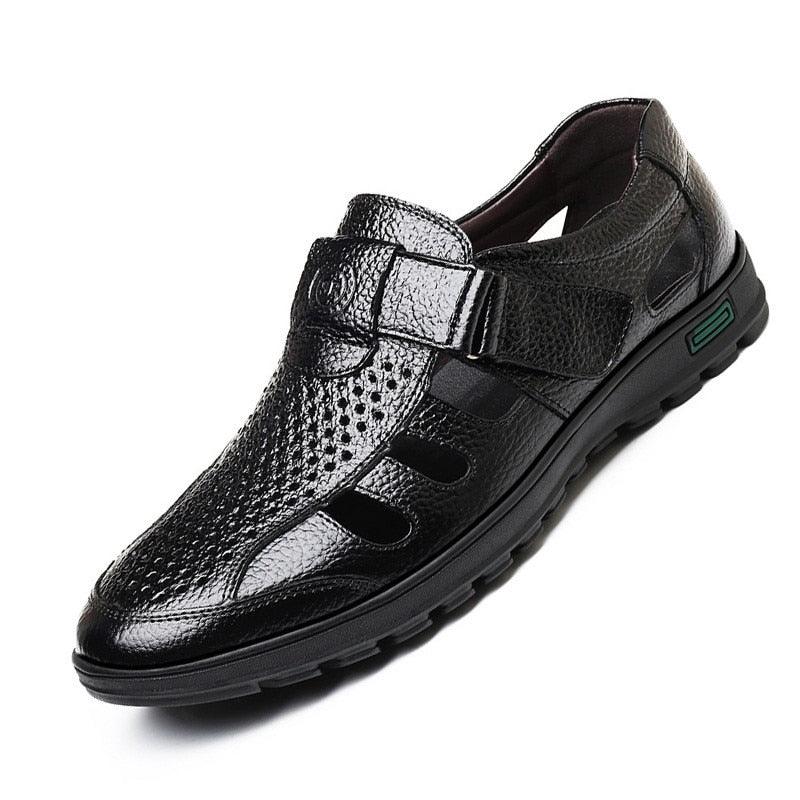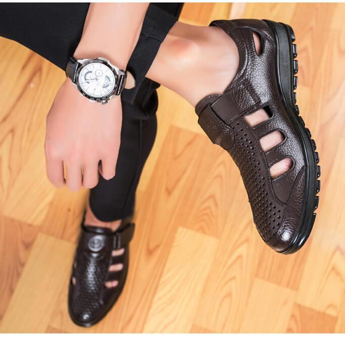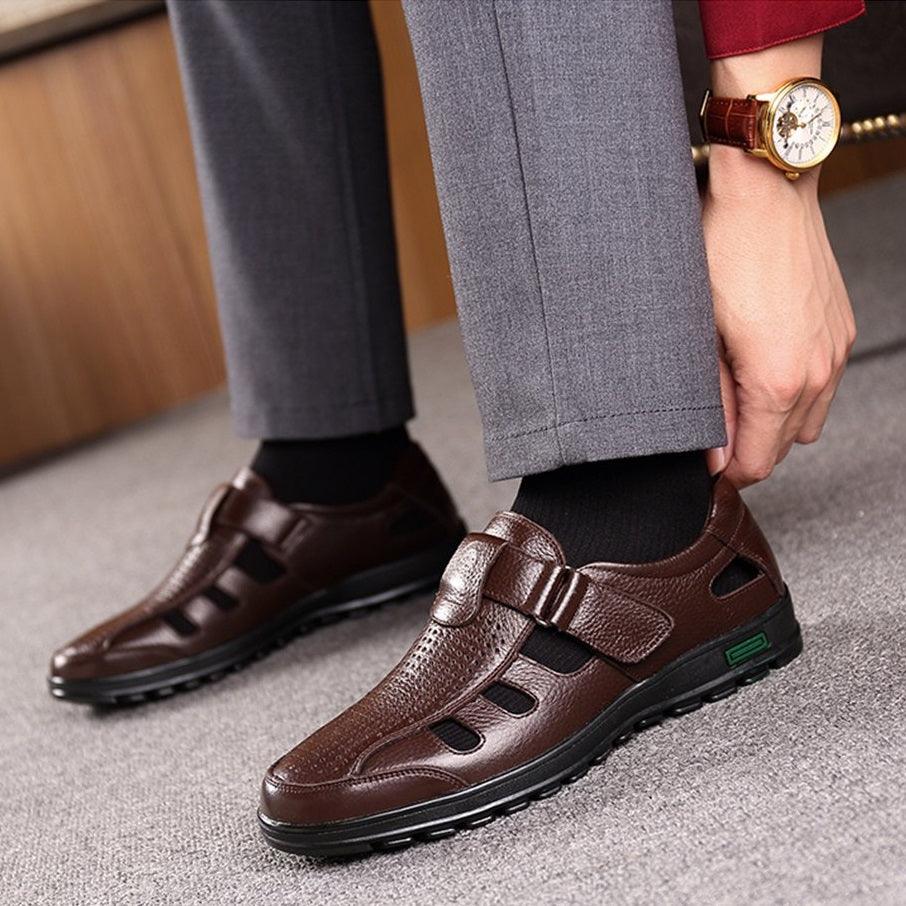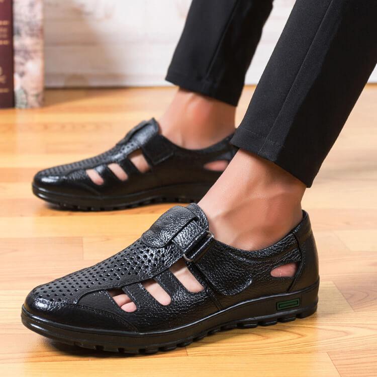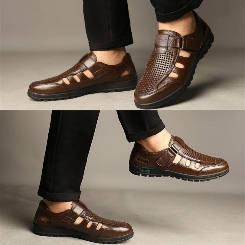 Confeccionado em couro, é aberto, respirável e totalmente antiodor. Contém velcro para fechar e calçar de forma prática, ideal para homens que buscam qualidade da rotina.